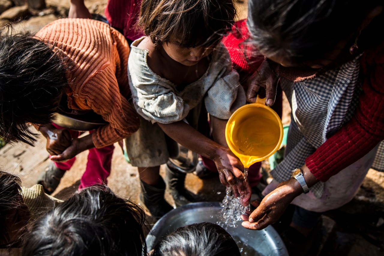 Published February 23, 2014 at 5760 × 3840 in Kynja Babha’s Day at the Anganwadi ← Previous Next → Helped by her teacher, Kynja washes her hand before the mid-day meal is served.